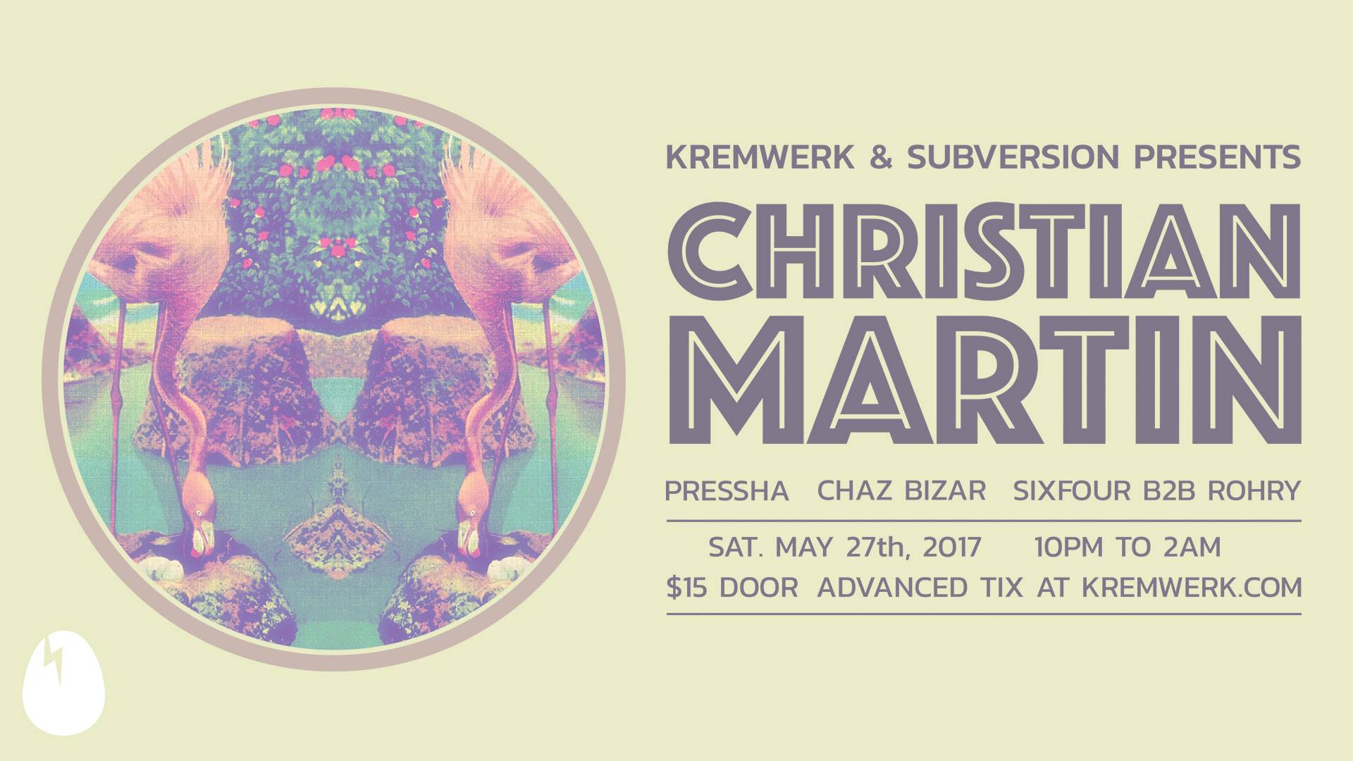 We’re incredibly honored to welcome Dirtybird co-founder Christian Martin to Kremwerk along with a phenomenal arsenal of support. Learning the craft in 2002 from fellow DB co-founder and brother, Justin Martin, proved to be the initial domino that’s led to 15 years of eclectic shows & releases. The brothers linked with Claude VonStroke, J.Phlip and Worthy in 2003 to establish a worldwide brand aimed to bring the music to the top of the priority list. Branching out from an intimate BBQ party in San Francisco, Dirtybird has transformed multiple times since then, from a residency to a full blown international label recognized around the globe. A collective of artists looking to stay true to their brand and bring their sound to the masses, Christian Martin brings a rich history with electronic music to the table.